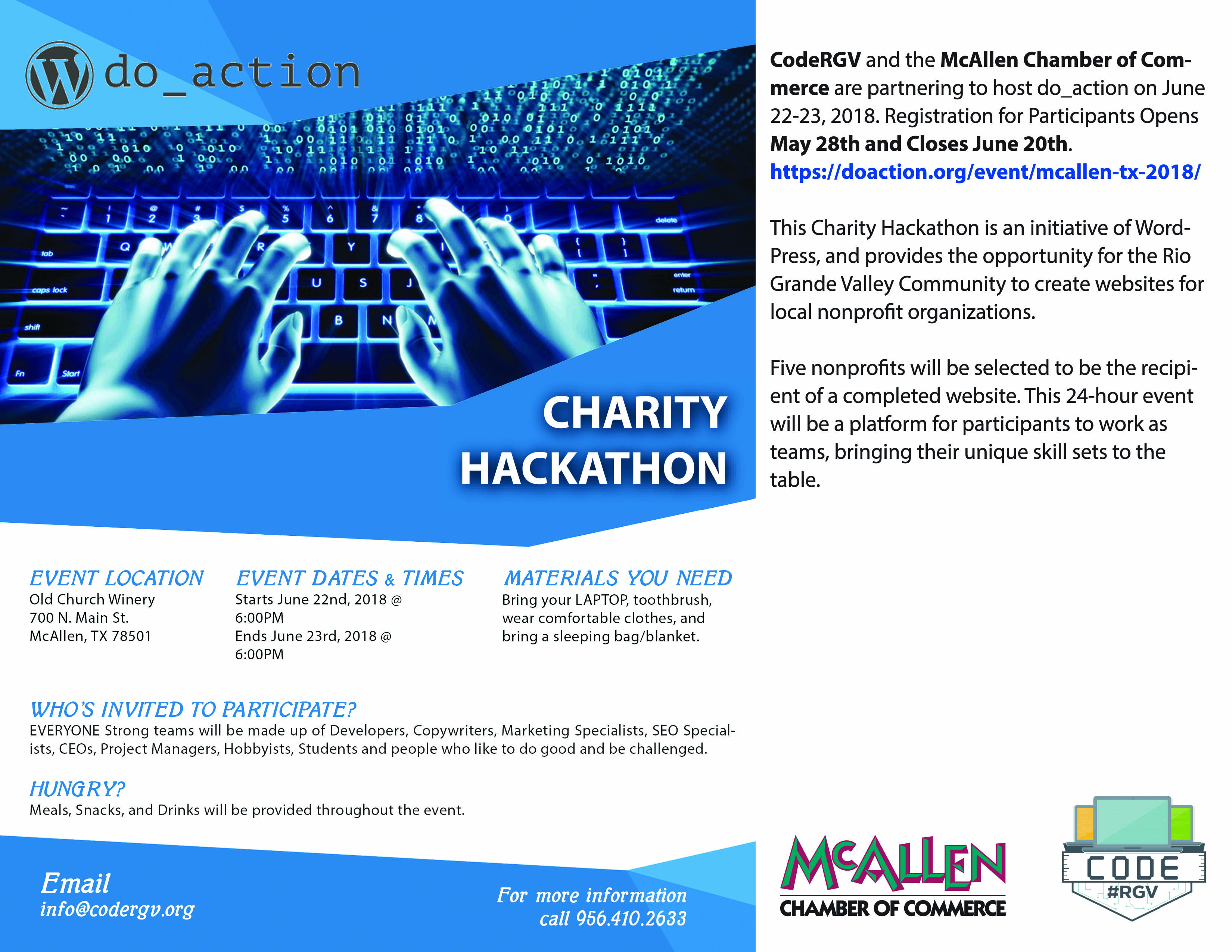 CodeRGV and the McAllen Chamber of Commerce are partnering to host do_action on June 22-23, 2018. This Charity Hackathon is an initiative of WordPress, and provides the opportunity for the Rio Grande Valley Community to create websites for local nonprofit organizations. Five nonprofits will be selected to be the recipient of a completed website. This 24-hour event will be a platform for participants to work as teams, bringing their unique skill sets to the table.